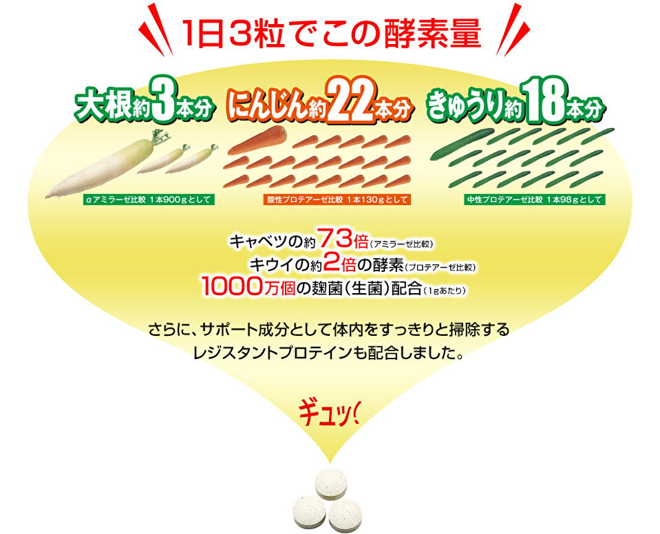酵素は、タンパク質の一種で、代謝や消化、呼吸など人間のあらゆる 活動を支え、維持する源です。 体内の酵素が不足すると、基礎代謝がダウンするので、体重が 落ちにくい、疲れがとれない等の悩みが出てきます。 でも、基礎代謝を維持するために不可欠な酵素は、20歳前後を ピークに、30代、40代と減少し、50代では半減すると言われています。 ですから、毎日の食生活で酵素を摂取していく必要があるのですが、 加工食や加熱食が多い現代の食生活では、生きた酵素を体内に 摂り入れる機会が減っているのが事実です。 酵素は60℃以上の熱を加えるとほとんどが活性を失います。 最近流行の酵素ドリンクは熱加工するのが前提ですから、 酵素ドリンクでは酵素不足を補うことはできません。 そこで、おすすめなのが、「こうじ酵素」。 ビタミンやミネラルを豊富に含む7つの穀物を麹菌で発酵しているので、 たった3粒で大根3本分、にんじん22本分、きゅうり18本分もの 生きた酵素をたっぷり含んでいるんです。 酵素がしっかり生きたままなので、日々の食事で摂取できない酵素を 1日たった3粒でしっかり補うことができます。 7日分21粒を100円モニターで募集しますので、この機会に